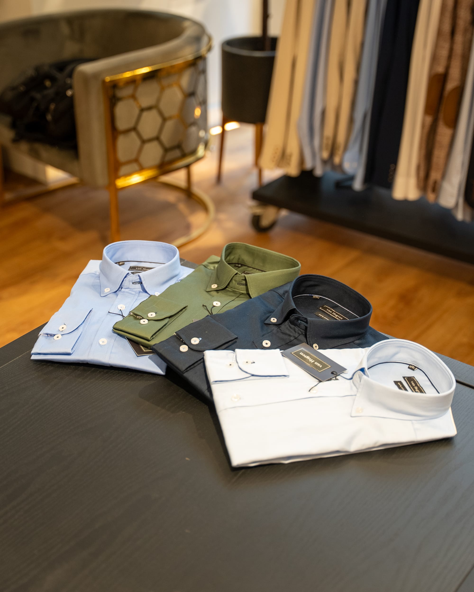 Studio van Hugten heeft een uitgebreide collectie voor de man die kwaliteit waardeert, maar toch betaalbaar is. Pullovers, hemden, broeken, jeans en colberts van goede merken en sinds kort ook hemden onder eigen label. Jasper: “Ik probeer steeds te vernieuwen en hemden onder eigen naam stond al een tijd op mijn wensenlijst. Voorwaarde is natuurlijk de kwaliteit en de betaalbaarheid. Dat moet kloppen, maar ik ben blij dat nu de eerste hemden in de winkel liggen.”