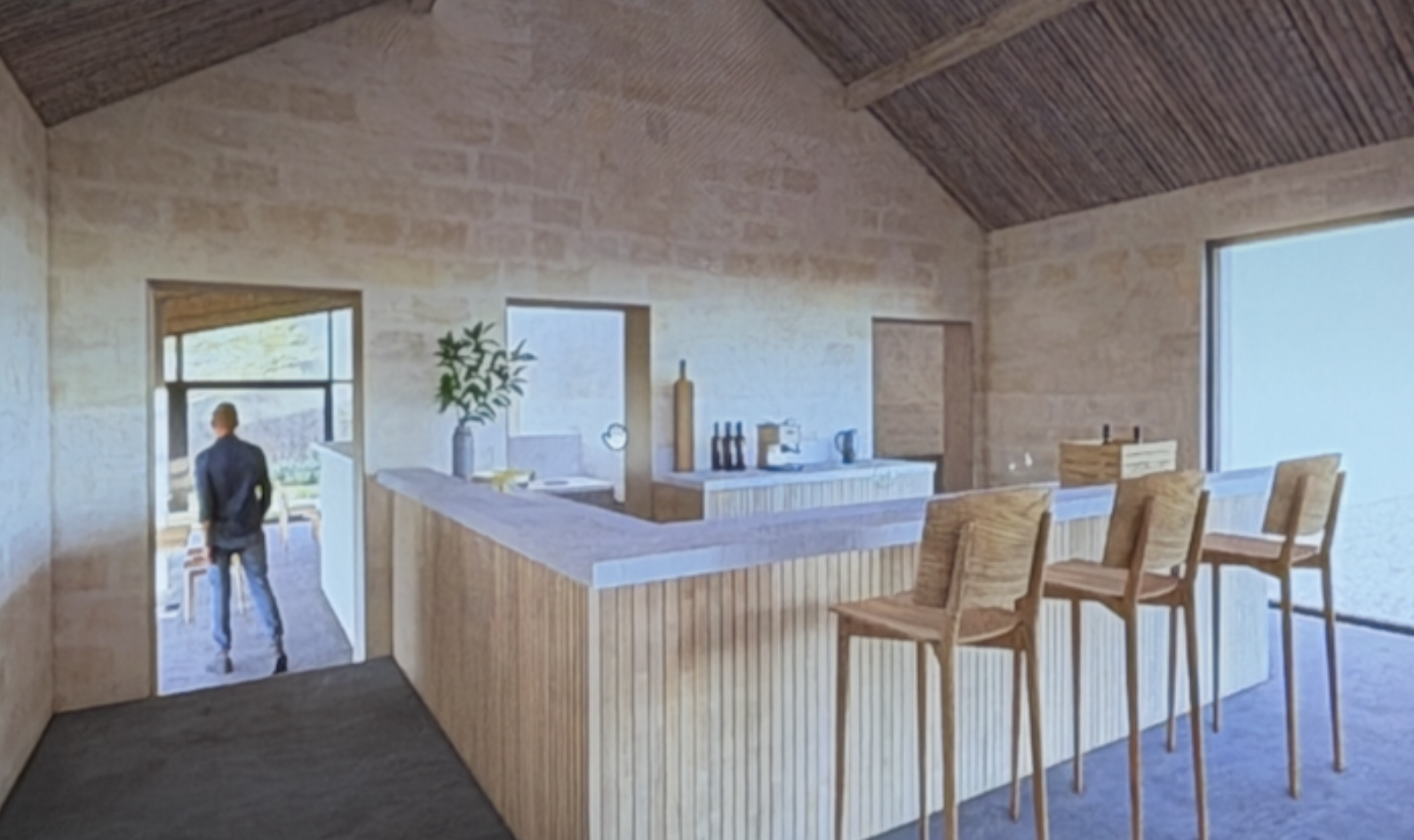 Om in het proeflokaal te komen moeten er doorgangen in de bestaande, al vaker vernieuwde, mergelmuur worden aangebracht. Behalve deuren worden ook 'schietgaten' toegevoegd, die de gasten al een 'sneak preview' op het dal geven. Tegen de schuur komt nog een pergola van spanten, die overgroeid moeten worden met wijnranken.