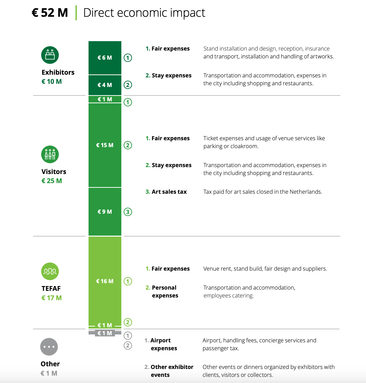 Heel veel sectoren profiteren van het MECC. De stad ontvangt de toeristenbelasting van mensen die in de stad overnachten. Volgens de onderzoekers was er in 2025 sprake van 41.249 bezoekers. Een groot deel bleef in de stad overnachten, gemiddeld bijna drie nachten. Uiteraard profiteert ook het MECC van de beurs, de taxibedrijven, touringcarbedrijven, standbouwers, cateringbedrijven, beveiligingsbedrijven, transporteurs en verzekeraars van de TEFAF. In de stad vloeit het geld royaal naar de horeca en winkels in het centrum. De Nederlandse schatkist profiteert door de btw op alle diensten en door de belasting op verkochte kunst. Maastricht Airport profiteert van de extra inkomsten van start- en landingsrechten van privéjets. In de praktijk komt maar een heel klein deel van de bezoekers met eigen vliegtuig.