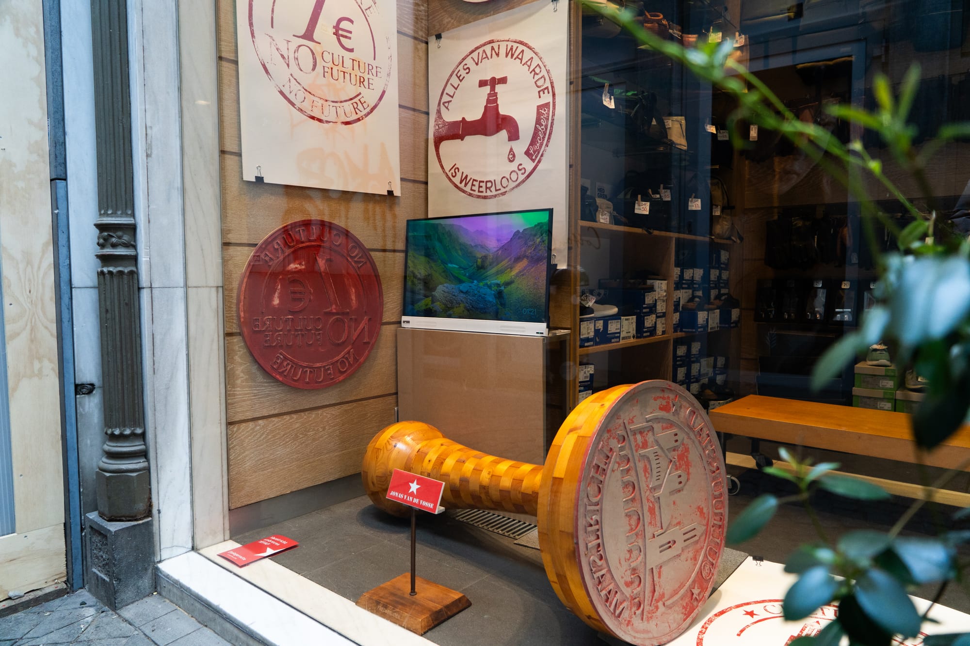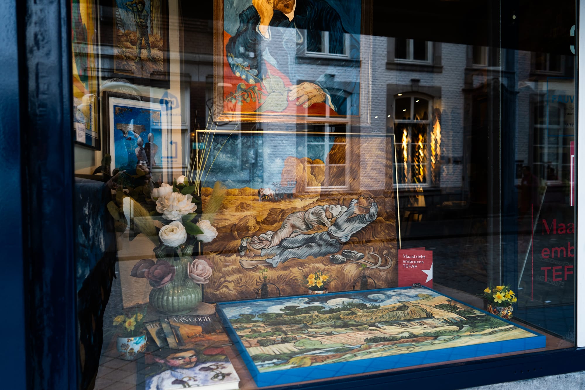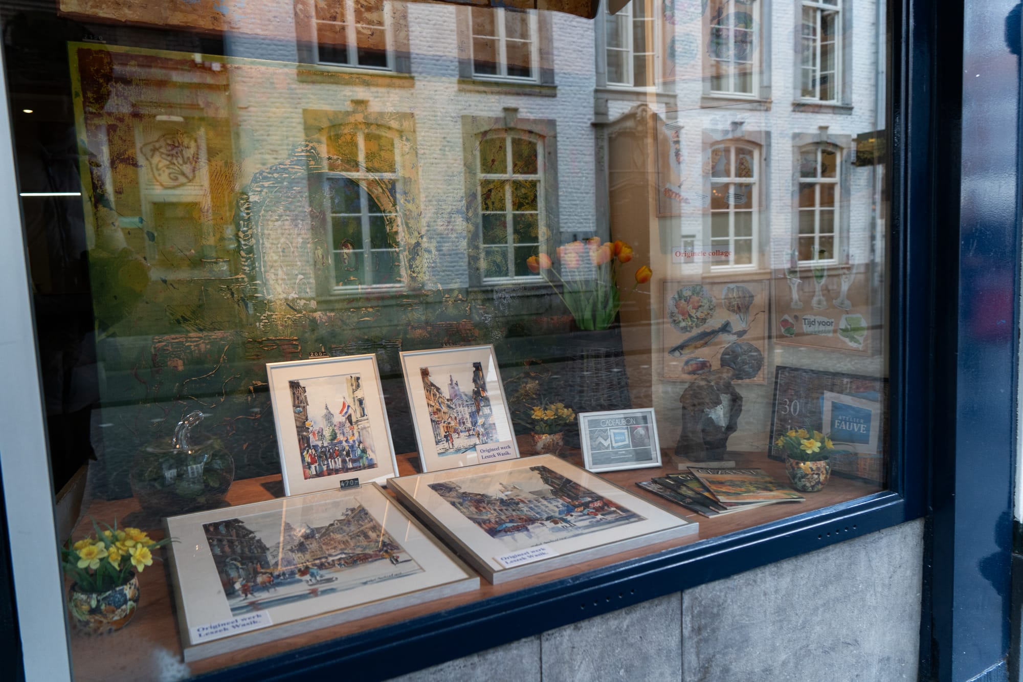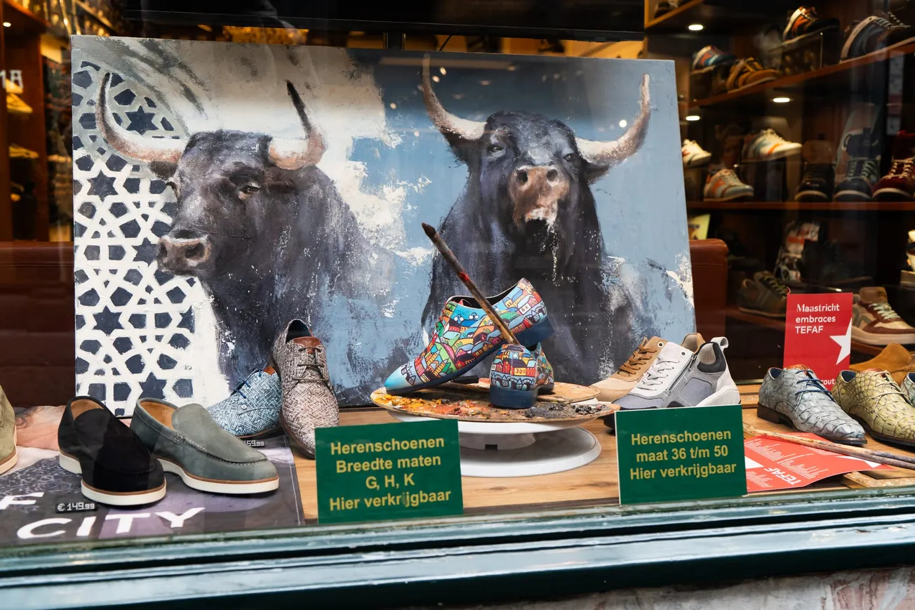 Vele tientallen etalages in Maastricht zijn dezer dagen mini-exposities, met een sterke knipoog naar de Tefaf in het MECC. Het is een mooie manier om de verbinding te maken tussen de kunst in het zwaarbeveiligde MECC en de kunst letterlijk in de 'kiekoet', aan straat. In een van de etalages wordt met één zin het belang van kunst uitgelegd: 'No culture, no future'. Onze fotograaf Sem Augustin maakte de volgende reportage.
