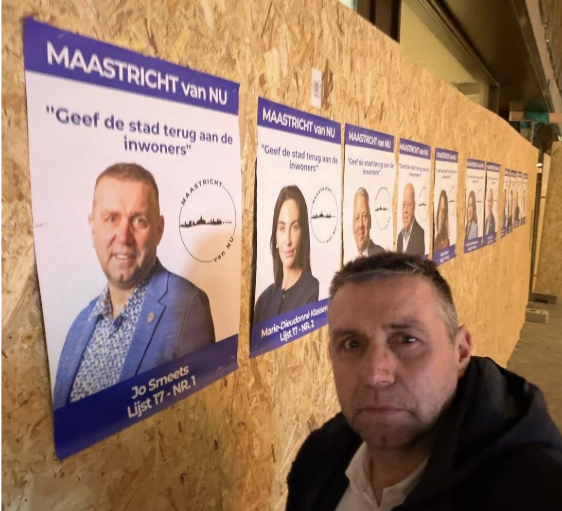 En waar de posters van De Tegenpartij bleven hangen, kunnen we dat niet zeggen van de posters van Maastricht van Nu van de Maastrichtse vrije jongen Jo Smeets. Die posters werden zaterdag geniet op de vele houten platen die de etalages van de winkels beschermen. Politieke carnavalssnuutskes, dat vond niet iedereen sjiek&sjoen. Ouderwetse plakoorlog in Maastricht.