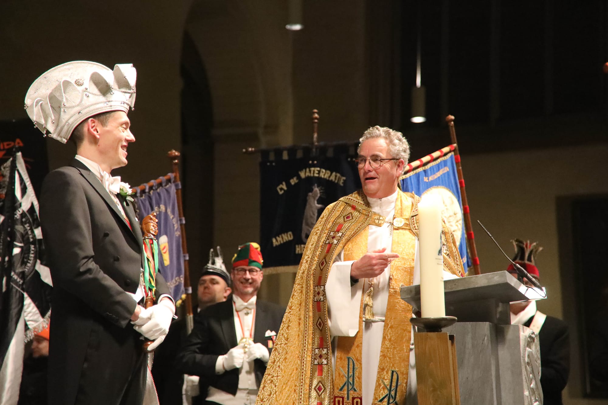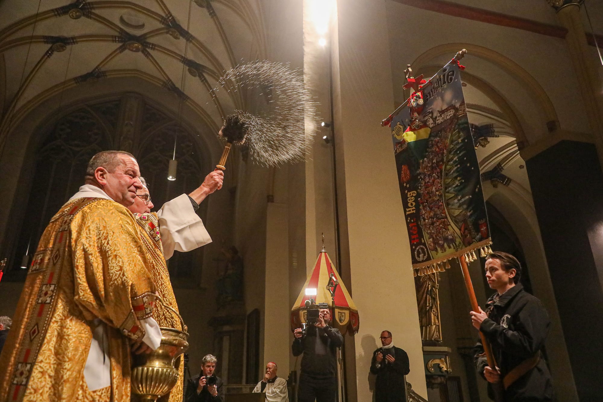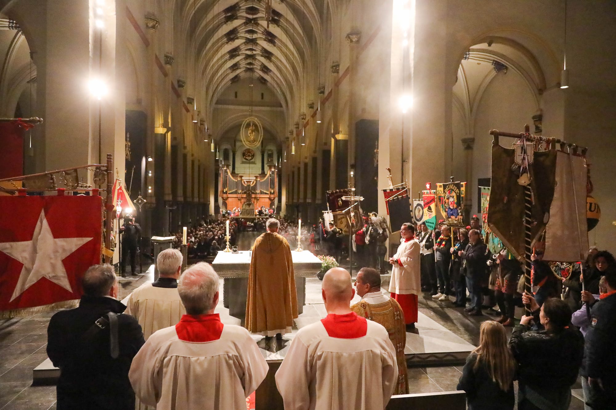 De opkomst van al die Maastrichtse vastelaovendsgezelschappen is zonder overdrijven indrukwekkend. Net zo zeer de anderhalf uur dat al die veendeldregers op het altaar in het gelid staan. Dat deken John Dautzenberg bij dit soort gelegenheden de juiste man op de juiste plaats is, dat bewees hij ook woensdagavond. Met zijn Kirchraojse tongval of woorden lukt het hem zonder inspanning ook een Maastrichtenaar te zijn, zo u wilt: eine vaan us.