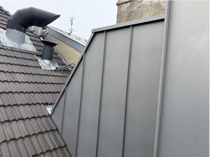 Met de klok mee: de trap, aan de buitenkant de met zink beklede dakdoorvoer, de twee dakopeningen die wel vergund zijn omdat de goot blijft doorlopen, en twee foto's - van de nieuwbouw- die laten zien dat er van buitenaf helemaal niets is te zien van de dakdoorvoer voor de trap.