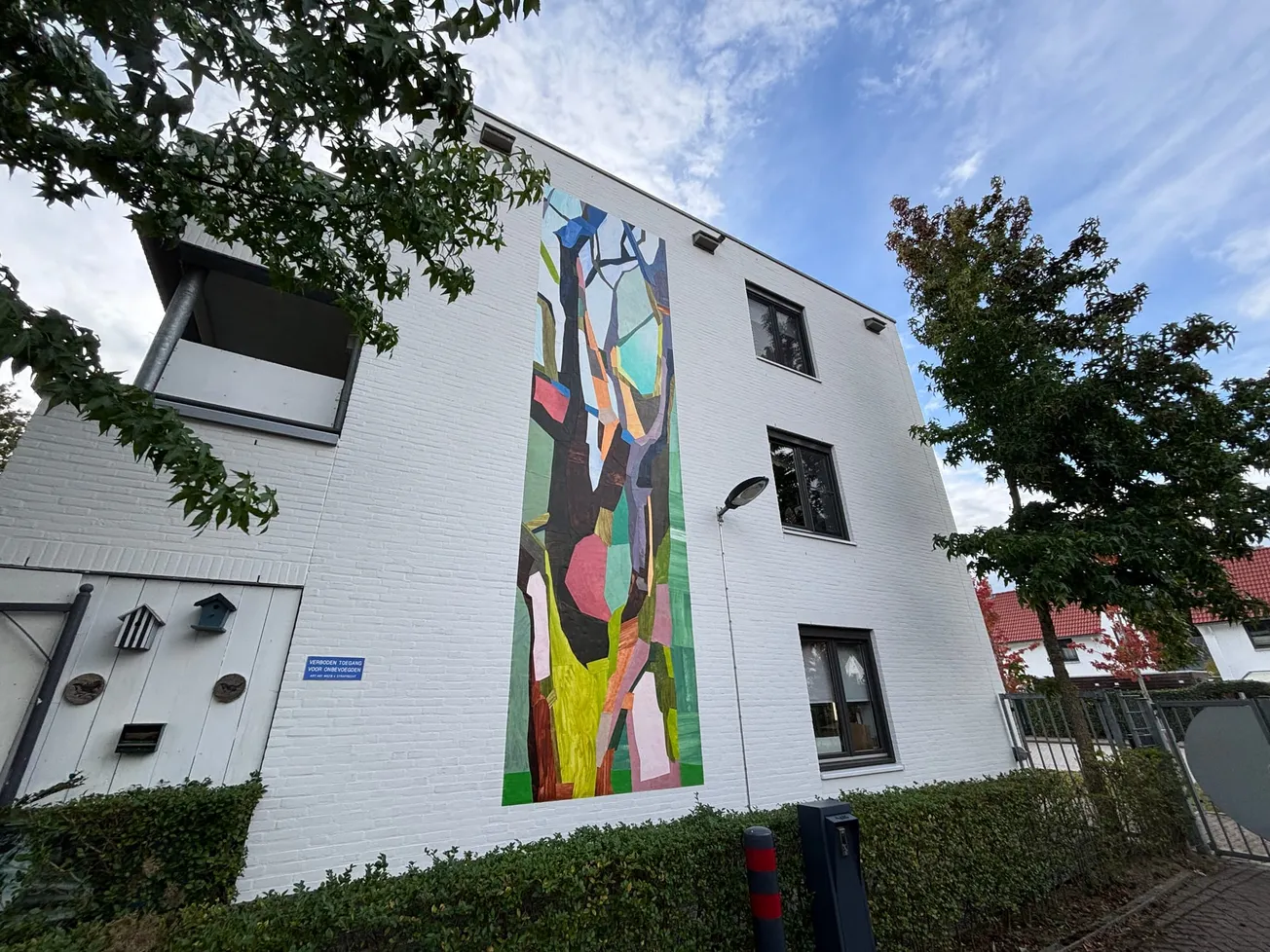 Een muurschildering is het niet: het kleurrijke werk is gemaakt van synthetisch papier dat voorzien is van een nano-coating die waterafstotend is. Van der Ploeg had 2,5 week op de steiger nodig om het werk aan de muur in elkaar te zetten.