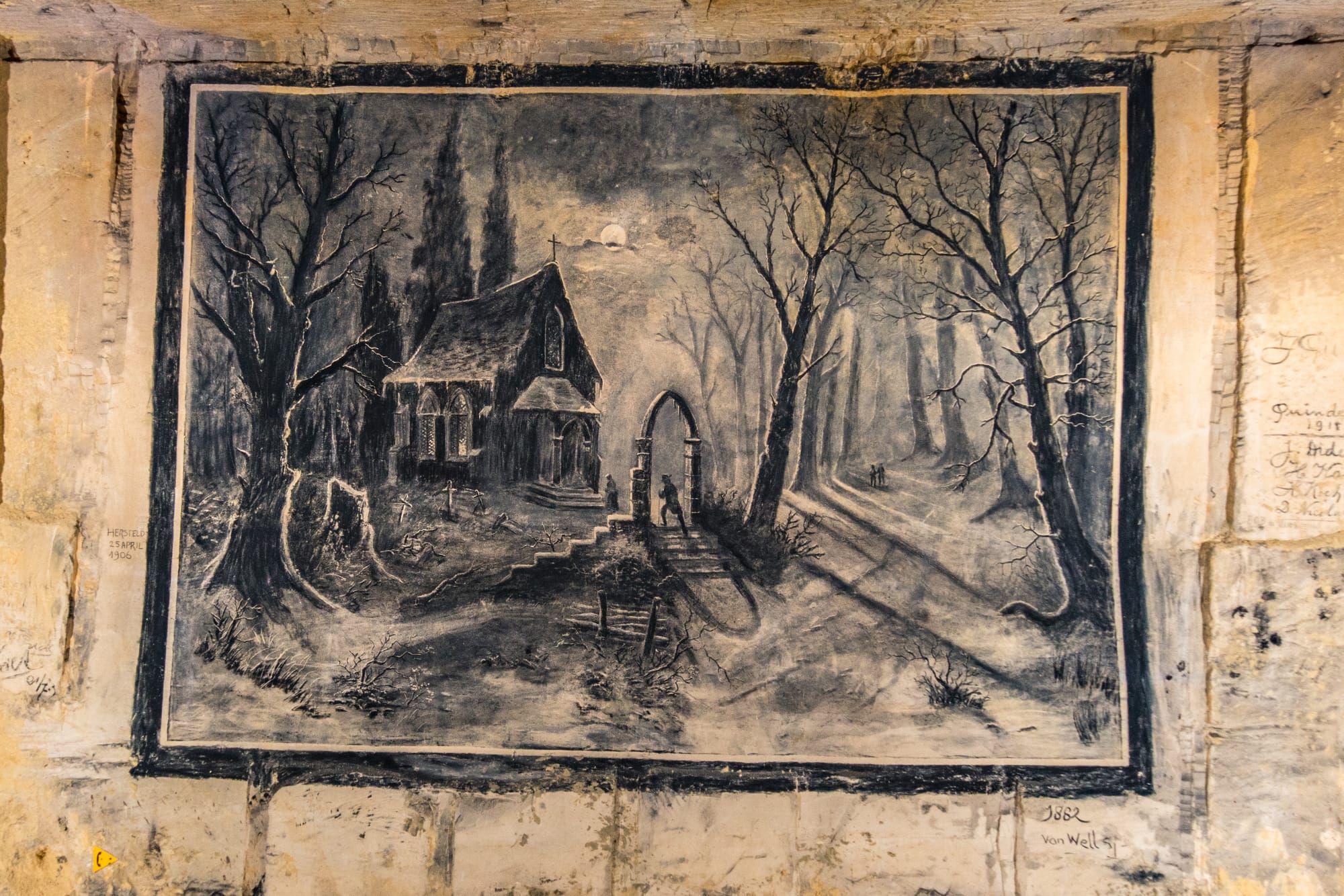 ‘De Kerstnacht’ is voor Peter Houben een van de mooiste werken in de groeve. Het is een houtskooltekening die in 1882 werd gemaakt door pater Joannes van Well. Hij liet zich hierbij inspireren door het werk van de Oostenrijkse schilder Albert Rieger. “Ik vind het een prachtig werk waar je uren naar kunt kijken. Het straalt mysterie uit. Maar om heel eerlijk te zijn vind ik eigenlijk alles in de berg mooi.”