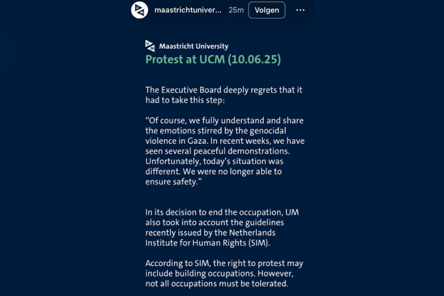 "Ons besluit over de samenwerkingen gaat uit van de huidige situatie en blijft onveranderd van kracht. Uiteraard kunnen toekomstige ontwikkelingen leiden tot een nieuwe beoordeling. Dat kan zich bijvoorbeeld voordoen inzake voorgenomen strategische samenwerking met partnerinstellingen in Israël. Het staakt-het-vuren geeft enige hoop daarop, maar de situatie is nog precair en onzeker. Vooruitlopen op mogelijke ontwikkelingen ten goede, is op dit moment prematuur. Tot nieuwe strategische partnerschappen met Israëlische instellingen zal het College van Bestuur alleen besluiten na het voldoen aan de door ons gestelde voorwaarden en met inachtneming wederom van de advisering van de Human Rights Advisory Committee. Daarnaast sluiten wij ons aan bij de oproepen van onder meer de KNAW (Koninklijke Nederlandse Akademie van Wetenschappen) tot onmiddellijke humanitaire actie en herstel van essentiële infrastructuur in Gaza. En bij de oproep aan de Nederlandse regering om zich sterk te maken voor het opschorten van de deelname van Israël aan het EU-Associatieverdrag en andere vormen van wetenschappelijke samenwerking zolang schendingen van het internationale recht voortduren."