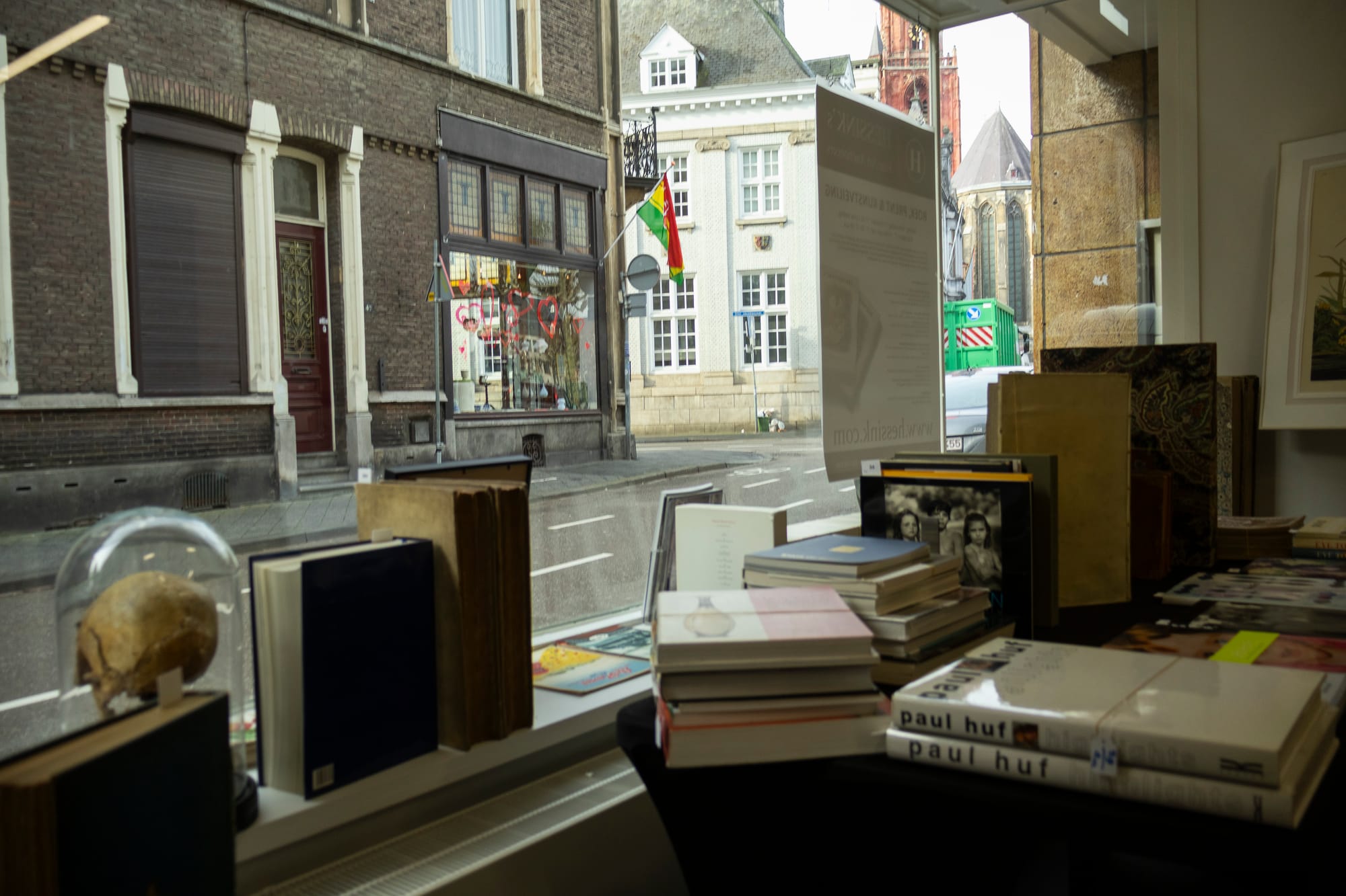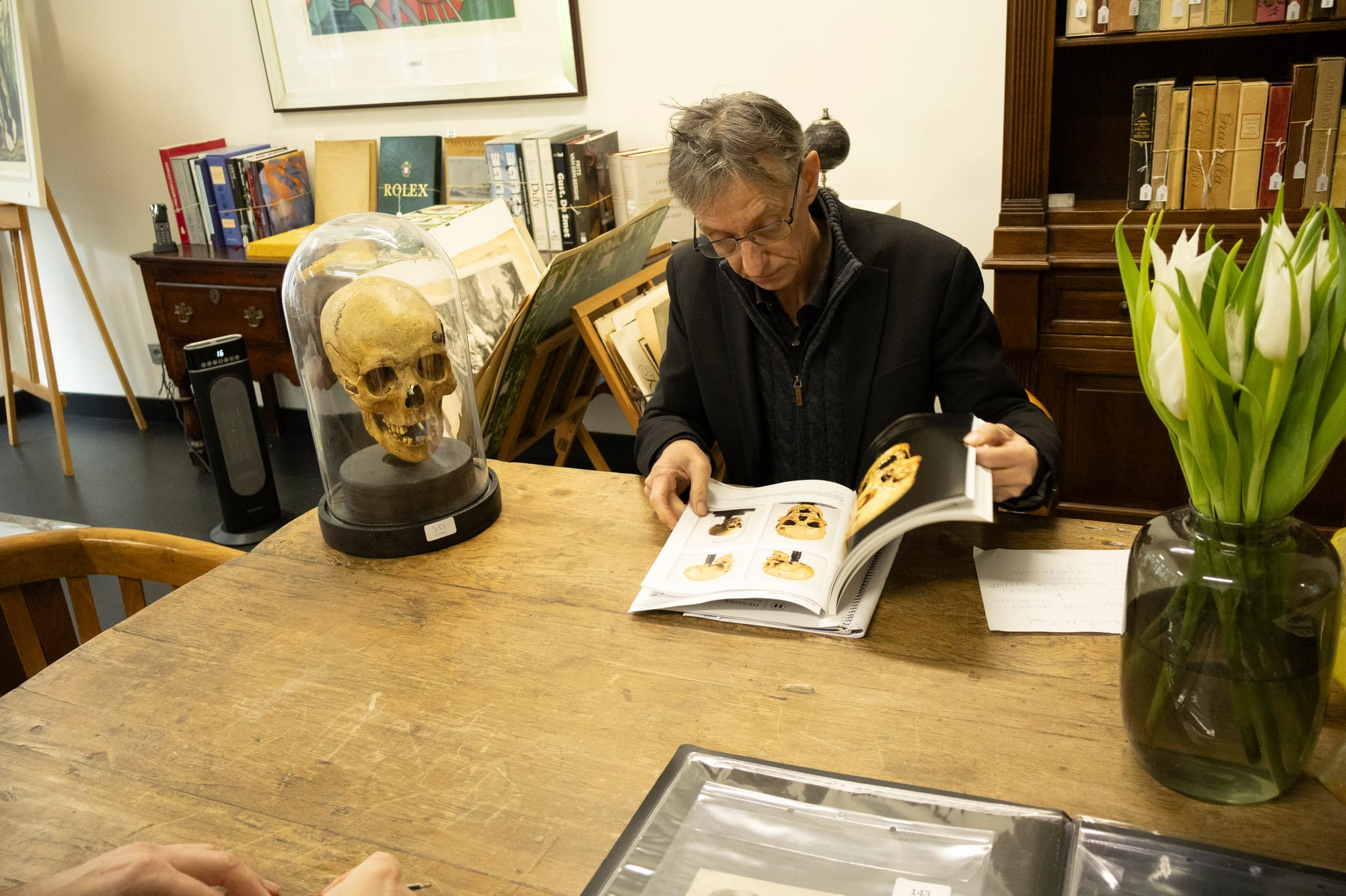 "Klanten die stukken willen laten veilen, kunnen ze altijd aanbieden via ons. Wij kijken dan of stukken geveild kunnen worden en maken een inschatting van de marktprijs. De schedel in de etalage? Ja, die komt van het Vrijthof en is ons vervolgens aangeboden door iemand die hier om de hoek woont. De schedel heeft een richtprijs van 500 tot 1200 euro en het eerste bod is al binnen."