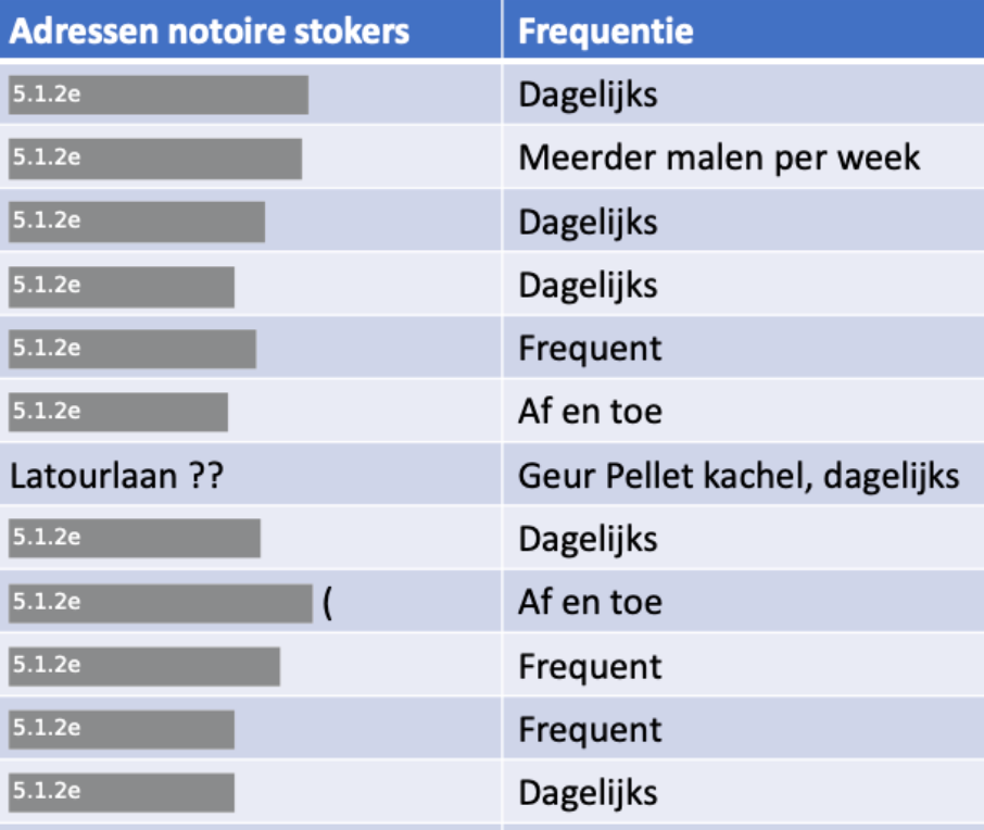 In zijn brief schreef de man: "Bijgaande treft u een powerpoint aan met alle locaties / adressen waar ik tijdens in mijn dagelijks leven (woon-werk verkeer, wandelingen met mijn hond en rondom mijn huis overal) overlast heb van allesbranders (vaak is er echt geen sprake meer van alleen houtstook)."