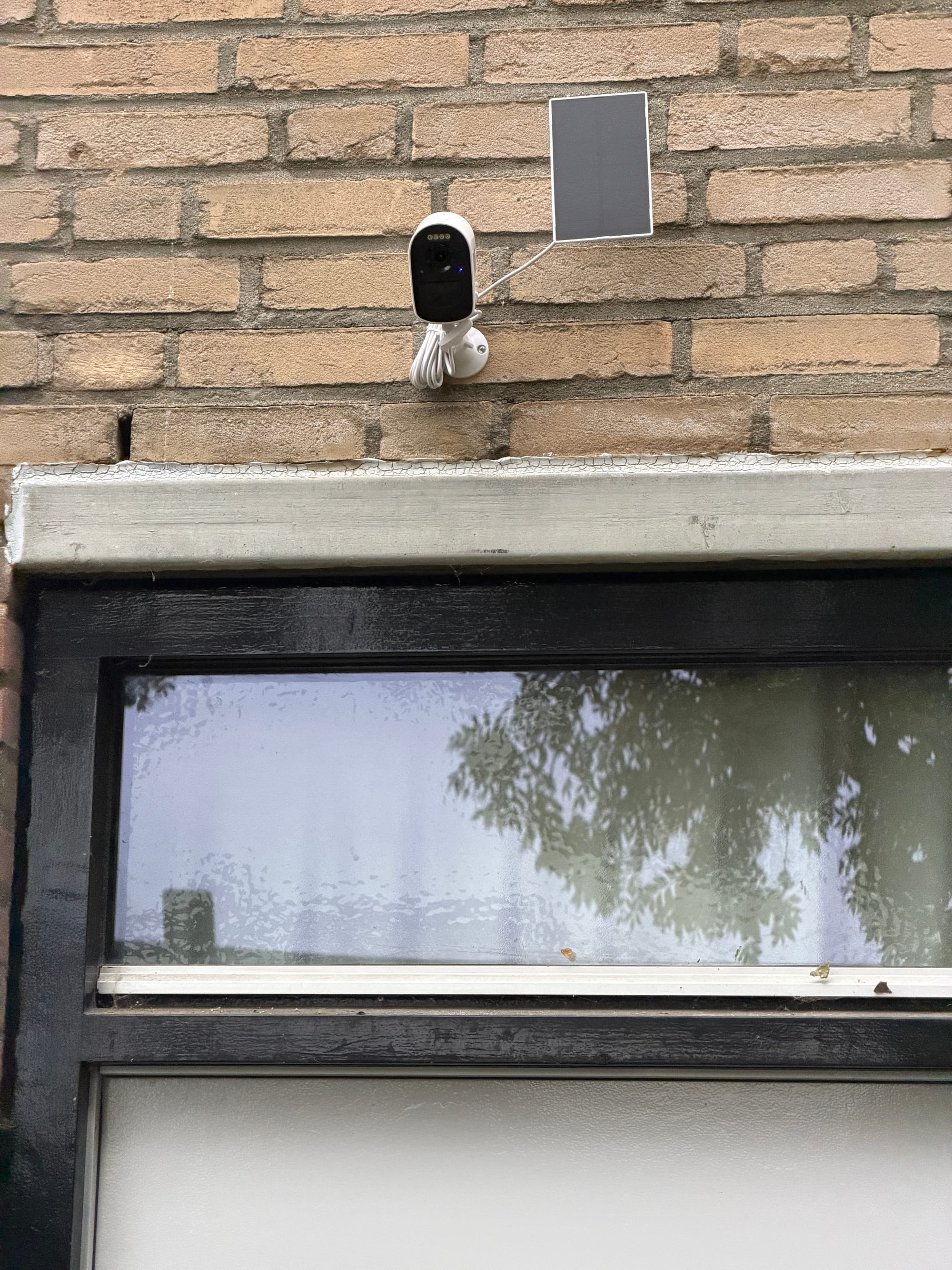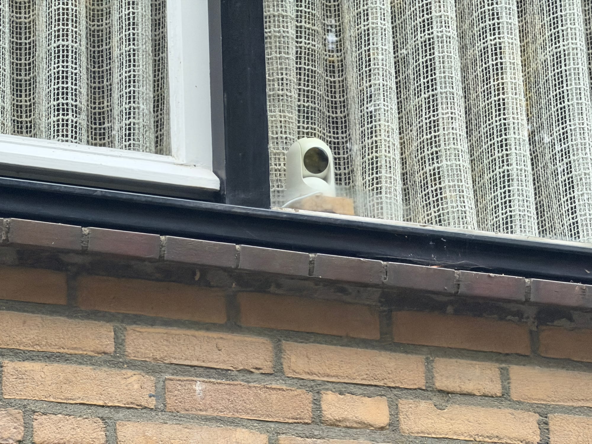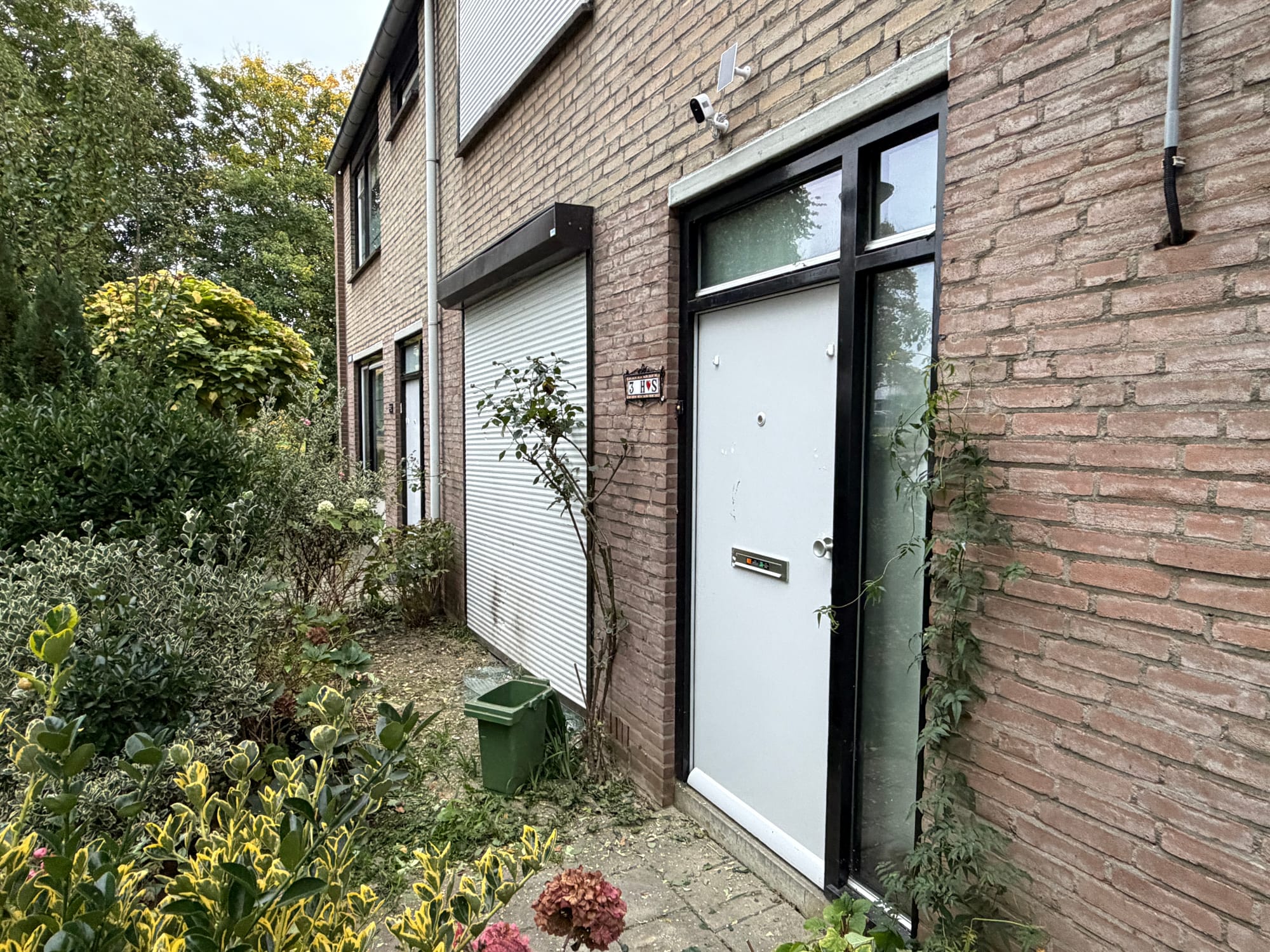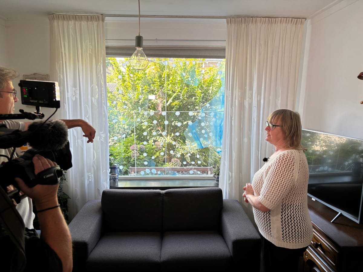 Hesham laat de beelden van de schades zien. Hij pakt het vernielde voordeurslot erbij en wijst van in de woning op de vernielde voorruit. Het rolluik is nu omlaag.