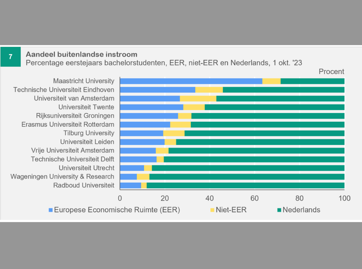 Uit de Observant: "Niet alleen Maastricht verwelkomde minder buitenlandse eerstejaars. Aan álle Nederlandse universiteiten toont die groep minder interesse: een daling van gemiddeld 6 procent. Dat blijkt uit de definitieve inschrijfcijfers die universiteitenvereniging UNL heeft gepubliceerd. De koepelorganisatie “maakt zich zorgen over het voorbestaan van opleidingen en het vertrek van internationaal talent,” zo staat er in een eigen persbericht. Uiteraard wordt verwezen naar de “rigoureuze wetgeving” van politiek Den Haag."