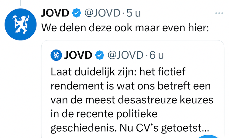 Niet alleen de JOVD maakt de eigen partij het leven zuur, ook op social media wordt massaal uitgehaald naar de VVD. Saillant: het voorstel voor deze belasting haalde het dankzij steun van onder meer GroenLinks/PvdA. Dat was toch de partij die VVD-leider Yesilgöz keihard uitsloot om nog iets van de landelijke verkiezingen te redden? Die gok pakte goed uit, maar Yesilgöz is die uitsluiting alweer vergeten. Net als haar voorganger Rutte heeft ze kennelijk soms wat last van haar geheugen.