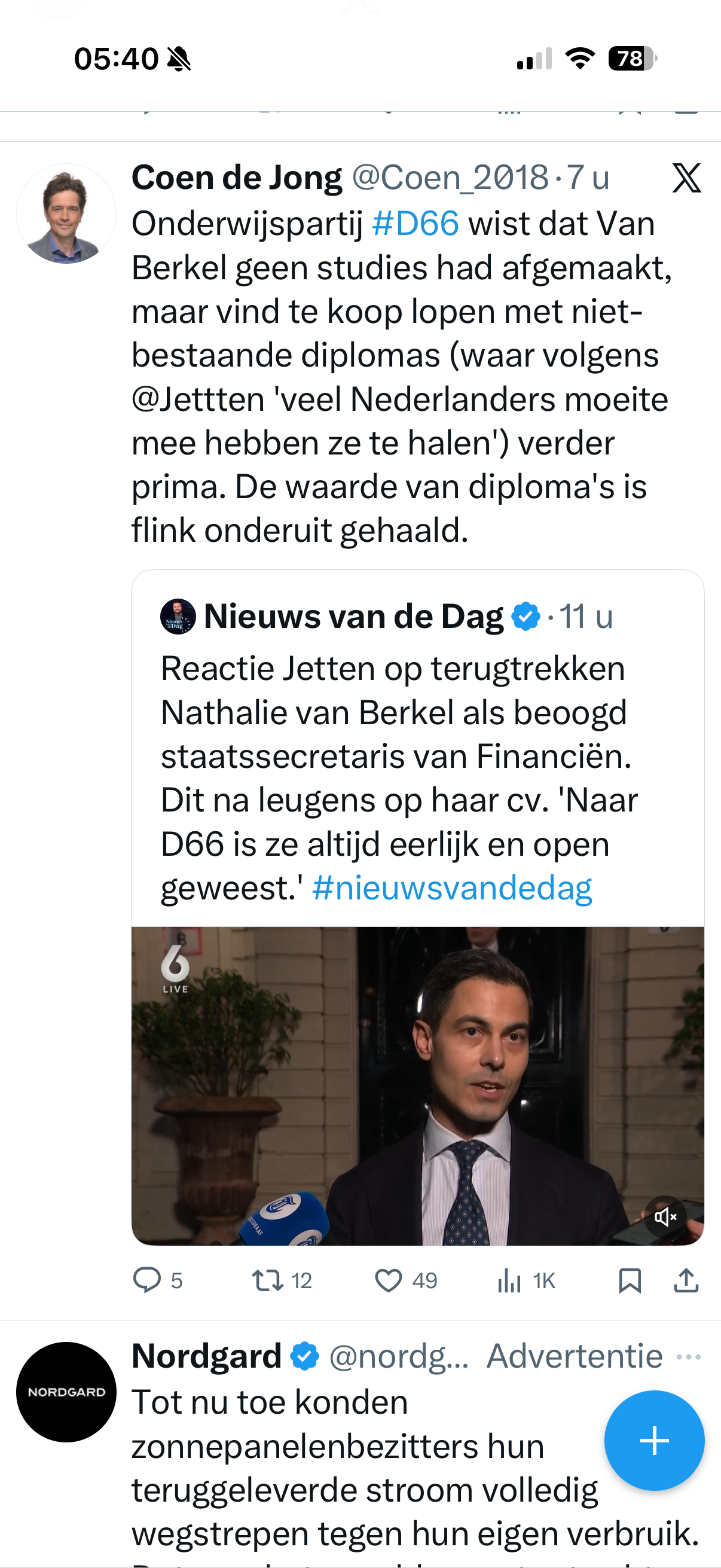 De onderwijspartij D66 maakt er landelijk nog een grotere puinhoop van. Nathalie van Berkel liegt consequent en keihard over haar CV en moet onder alle druk opstappen als beoogd staatsecretaris van Financiën nog voordat ze op het bordes heeft gestaan. Ze had haar CV ingevuld op basis van wat ze zich nog kon herinneren. Ja, en dan weet je zeker niet meer dat je je propedeuse al niet haalde maar doe je alsof je wel afgestudeerd bent aan de universiteit. Met zo'n geheugen ben je per definitie ongeschikt voor een baan als staatssecretaris.