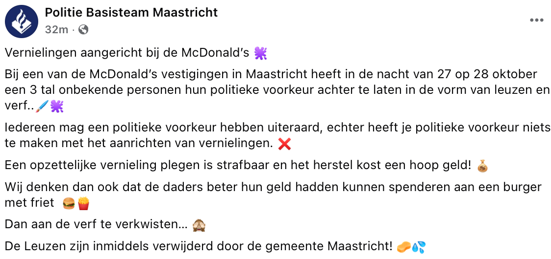 In een tekst met grappig bedoelde maar onnozele emoticons richt de politie zich rechtstreeks tot de daders: "Iedereen mag een politieke voorkeur hebben uiteraard, echter heeft je politieke voorkeur niets te maken met het aanrichten van vernielingen." En dan dit: "Wij denken dan ook dat de daders beter hun geld hadden kunnen spenderen aan een burger met friet. Dan aan de verf te verkwisten…"