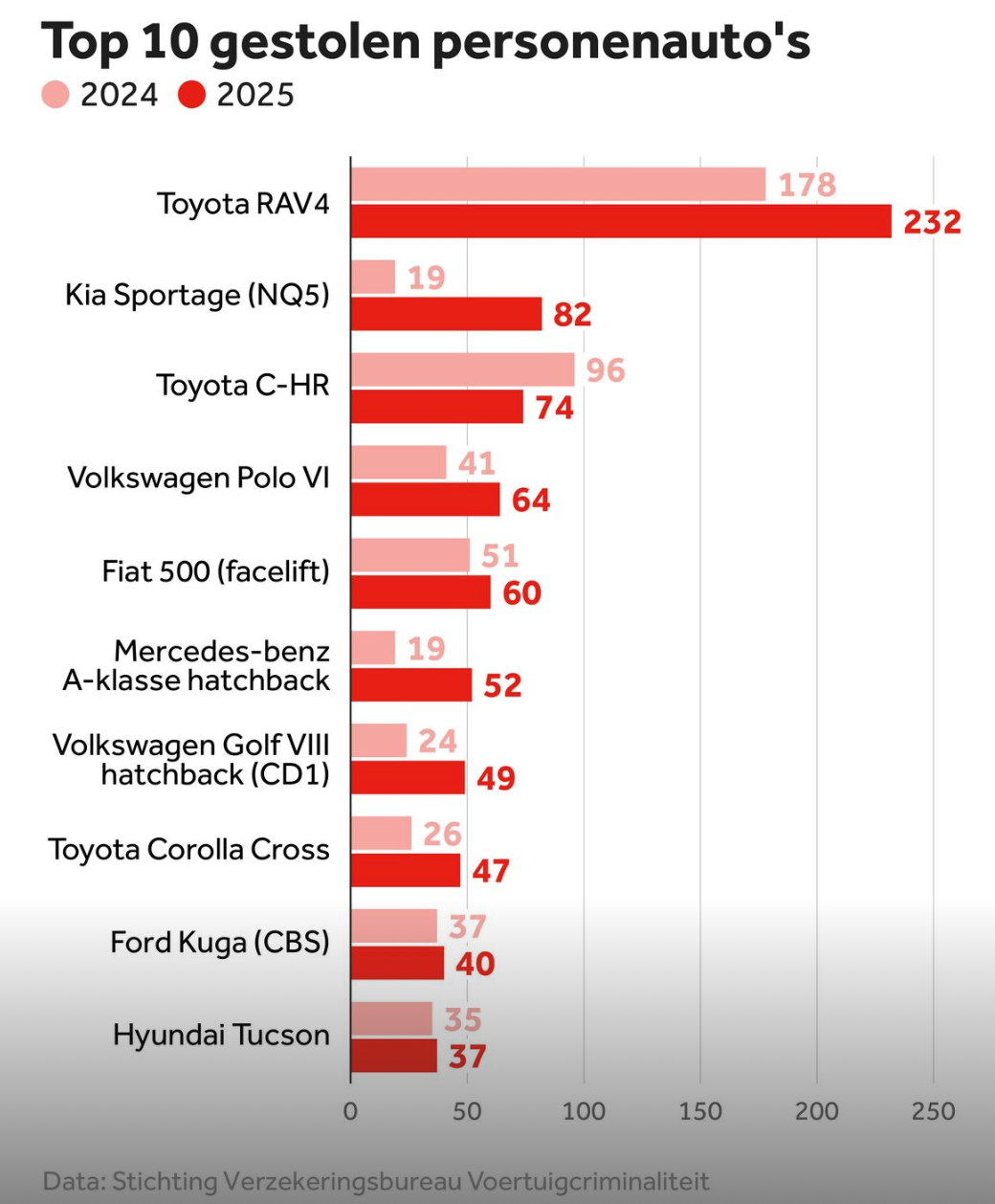Maastricht is geen uitzondering overigens op het landelijke beeld. Recente cijfers laten dat zien. In de eerste helft van dit jaar werden 3645 personenauto's gestolen, een stijging van ruim 20 procent ten opzichte van dezelfde periode vorig jaar. De Toyota RAV4 stond bovenaan de lijst van meest gestolen auto's, met 232 gevallen. Ook de Kia Sportage was opvallend in trek bij dieven: het aantal diefstallen van dat model verviervoudigde, van 19 naar 82.