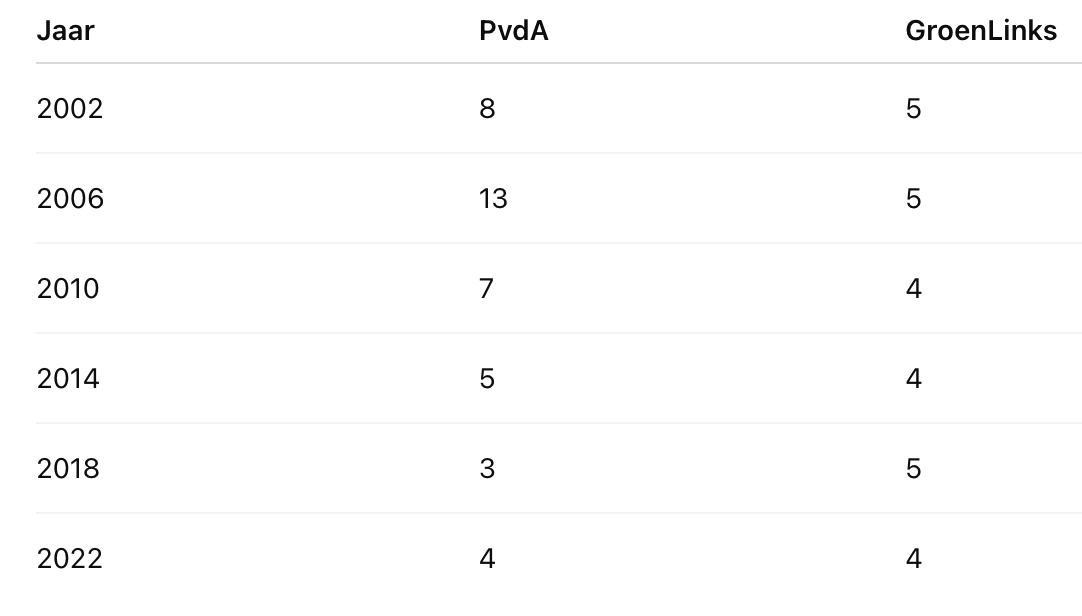 Interessant is het om te zien hoe PvdA en Groenlinks het lokaal doen in Maastricht. Van 2006 naar 2018 ging de PvdA van 13 naar 3 zetels. GroenLinks is al zes verkiezingen op rij goed voor 4 of 5 zetels. Vanaf 2014 hebben de partijen samen steeds 9 of 8 zetels gehad.