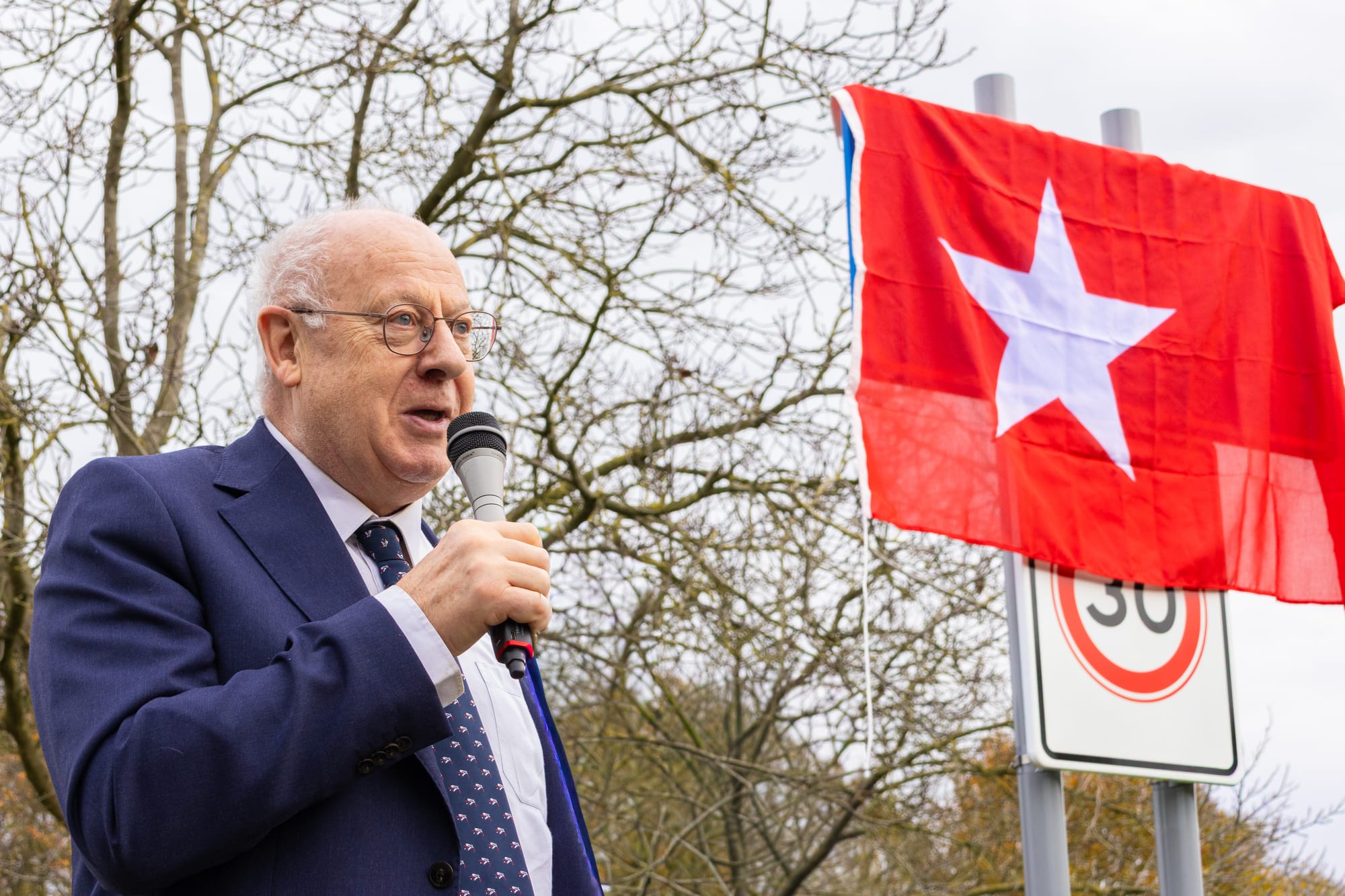 Wethouder John Aarts was vrijdag voor het eerst sinds lange tijd weer te zien in het openbaar. Hij onthulde het eerste tweetalige straatnamenbord aan de Via Regia.