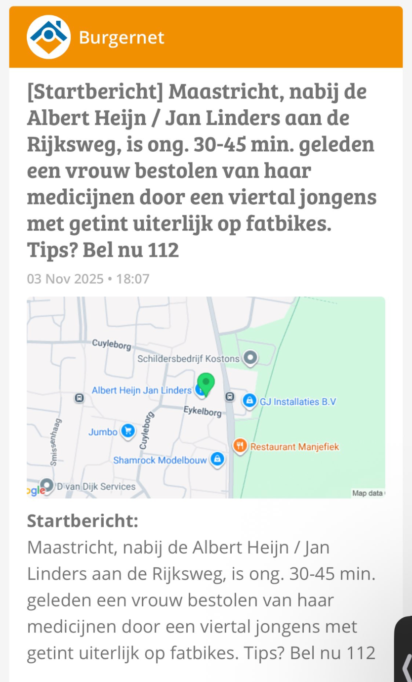 Burgernet plaatste op 3 november een bericht over een overval op een vrouw in De Heeg. Deze keer ging het om vier lichtgetinte daders op een fatbike.